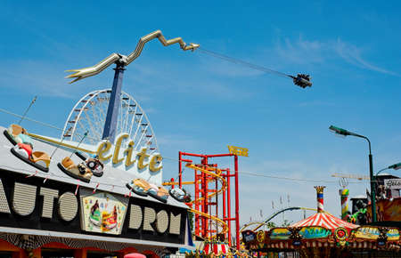 Munich, Germany - September 28: people on the highest mobile free fall tower in the world at the biggest folk festival in the world - the octoberfest