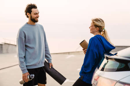 smiling young mixed race couple in sportswear warming up outdoors sity background early morning