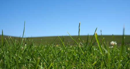 Fresh lush spring or summer green grass texture viewed low angle with blue sky horizon