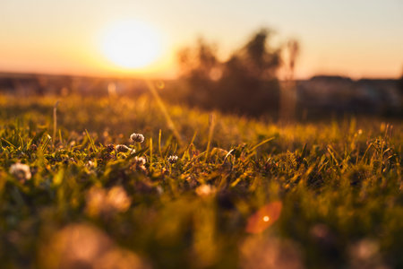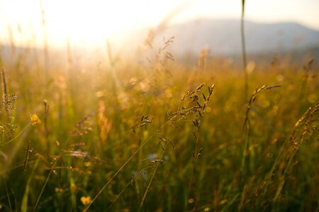 beautiful natural landscape - alpine meadow. Close-up grass with sunbeams. Beautiful nature landscape with sun flares.