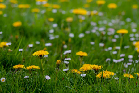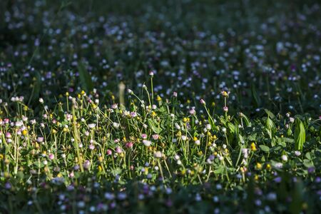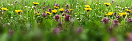 Spring meadow with colorful wildflowers. Seasonal nature background. Horizontal close-up with short depth of field.