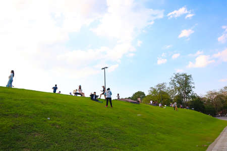 4 May 2020 ; Chiang Mai Thailand : People resting on fresh green park lawn in Chiang Mai University, Thailand.