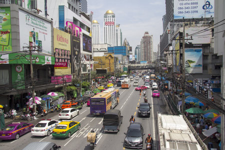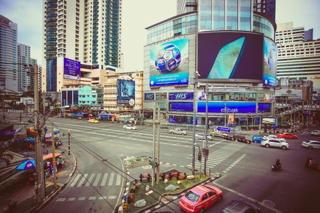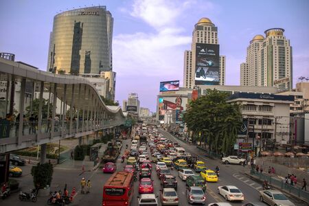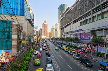 Bangkok, Thailand - January 10, 2016: Aerial view of Ratchadamri Road with traffic jams, where the Central World Shopping Plaza is located. It is the sixth largest shopping complex in the world