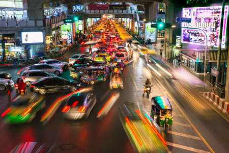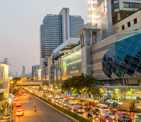 Bangkok, Thailand - April 22, 2016: Cars moving down the road in the heavy traffic conditions at Siam Square on April 22, 2016 in Bangkok, Thailand.