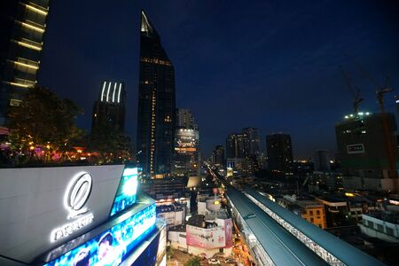 Bangkok, Thailand - 10 August 2022 - Aerial view of Bangkok cityscape at night after sunset showing high-rises and running BTS skytrains and crowded street below