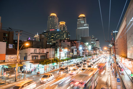 Bangkok,Thailand - 2 November 2017 : Night light with long speed shutter of traffic at MBK, BTS Siam interchange in front of Siam Discovery and Art Museum junction.This place is very famous shopping mall at central of Bangkok