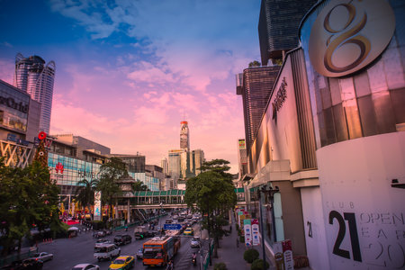 Traffic and modern buildings along Ratchadamri Road, at Siam, Bangkok, Thailand.