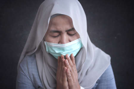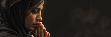 Arabian woman prays to god on dark studio background. Cinematic effect
