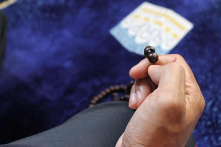 Hand holding a muslim beads rosary or tasbih on a praying mat, pray to god. Ramadhan Kareem