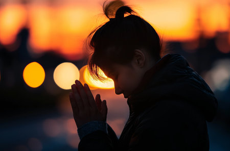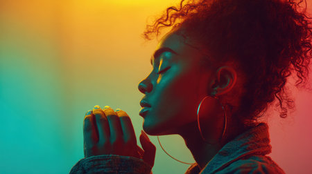 Profile of a woman with curly hair, hands together in prayer, softly lit by pastel colors, creating a serene atmosphere of contemplation and peace