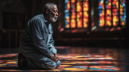 An elderly Black man is kneeling in prayer within a church, with colorful light from stained glass windows illuminating the wooden floor, evoking a peaceful ambiance