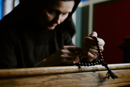 Close up of unrecognizable Black man praying in church with focus on hands holding rosary beads, copy space