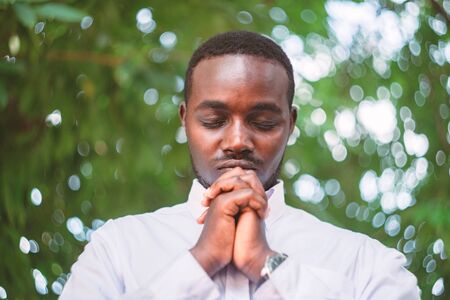 Peaceful African Man Praying In White Shirt Holding Clasped Hands In Prayer Gesture Standing With Eyes Closed Posing In Green Nature Background. Portrait Of Black Man Sending Prayers To God