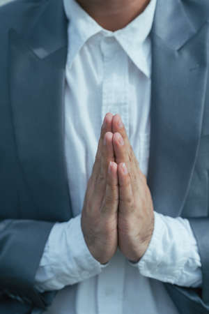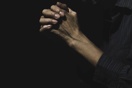businessman hand praying and worship to GOD Using hands to pray in religious beliefs and worship christian in the church or in general locations in vintage black tone or copy space.