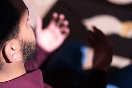 African Muslim Man Making Traditional Prayer To God. Religious black muslim man praying inside the mosque during ramadan