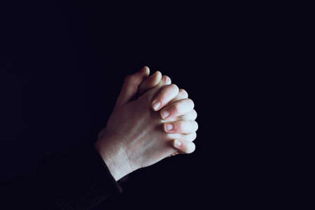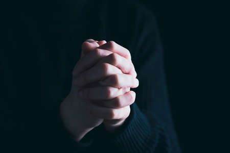 Praying hands with faith in religion and belief in God on dark background. Power of hope or love and devotion.