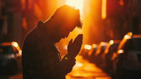 Silhouette of a man in prayer. The man folded his hands in communion with God. Dark background.