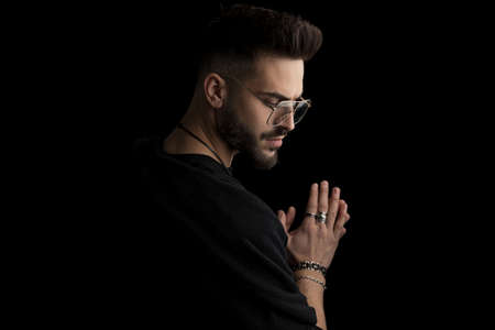 side view of cool sexy man wearing glasses, looking down and touching palms while posing on black background in studio