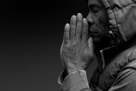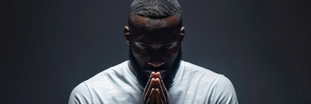 man praying to god with hands together Caribbean man praying with grey background stock photo