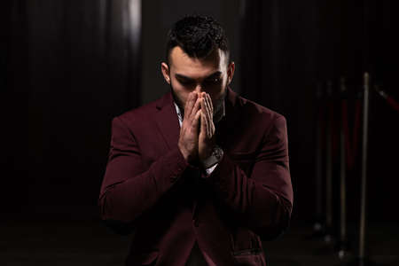Portrait of a young pensive man on a dark background, looking to the side, on a dark textured background. Hands folded in prayer gesture at the face.