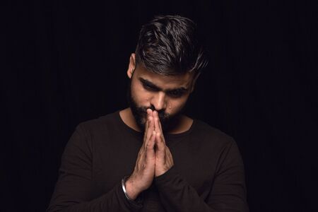 Close up portrait of young man isolated on black studio background. Photoshot of real emotions of male model. Praying and crying, looks sad and hopeful. Facial expression, human emotions concept.