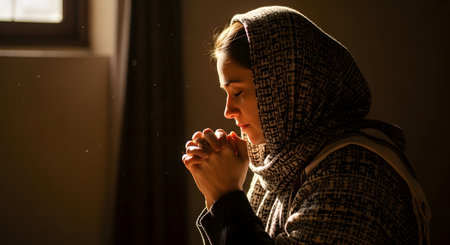 A woman wearing a traditional headscarf is shown in profile, praying with her hands clasped and eyes closed. She is illuminated by a soft, warm light in a dark room, creating a reverent and spiritual atmosphere with dust motes visible in the light beam.