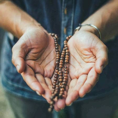 Hand holding a muslim beads rosary or tasbih on a praying mat, pray to god. Ramadhan Kareem.