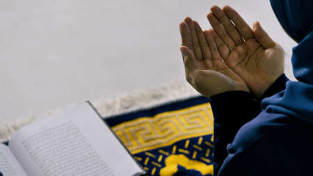 Muslim young woman in hijab is praying glorify Allah and practicing the Islamic faith in mosque.