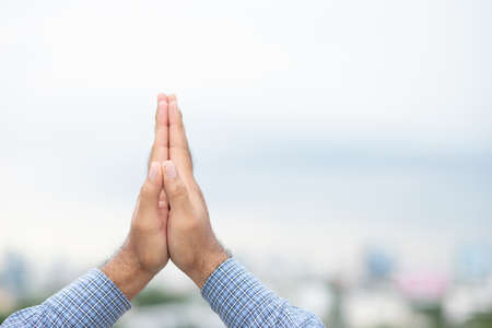 Praying hands with faith in religion and belief in God on blessing background. Power of hope or love and devotion.