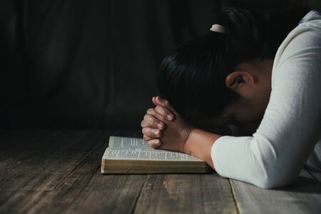 Christian life crisis prayer to god. Woman Pray for god blessing to wishing have a better life. woman hands praying to god with the bible. begging for forgiveness and believe in goodness.