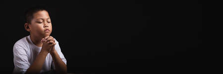Banner Christian life crisis prayer to god. Panorama Boy pray for god blessing to wishing have a better life.