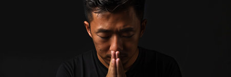 A man on a black background. Hands are folded in the position of prayer. Inner silence.