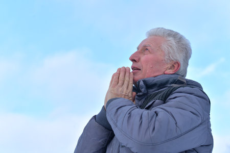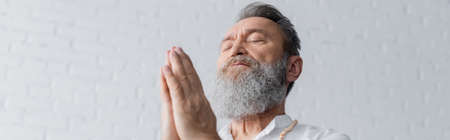 low angle view of guru man with grey beard meditating with closed eyes and praying hands, banner