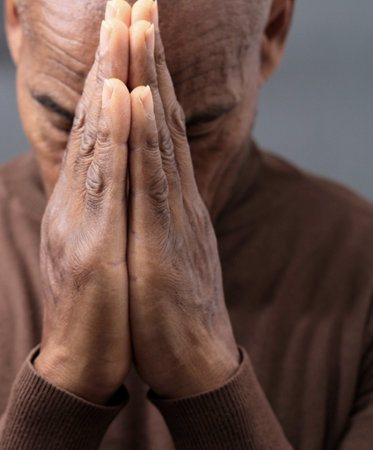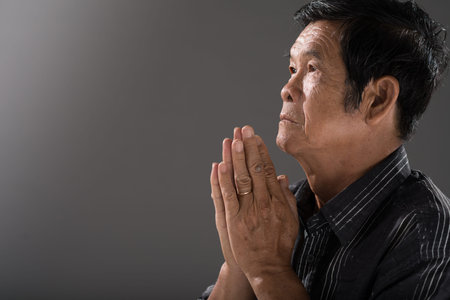 Praying hands of Buddhism. Elderly woman god for religion, belief, Holding hand in pray and thank buddha