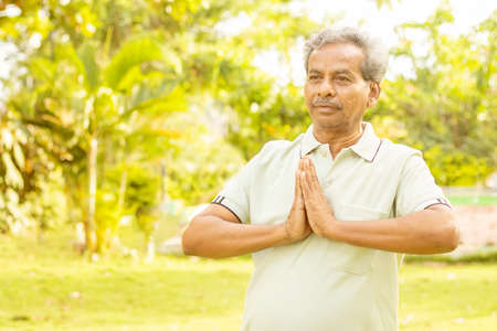 Senior man in namaste pose while doing yoga with copy space - concept of fitness, active healthy lifestyle and morning routine.