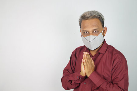 Portrait Asian young man pay respect, sawasdee symbol from Thailand greeting culture for hello or goodbye. Hand symbol means to pay respect and greeting others.