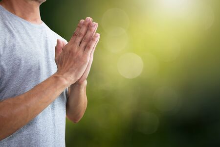 Asian man putting hands together praying isolated on blurred green nature background with clipping path