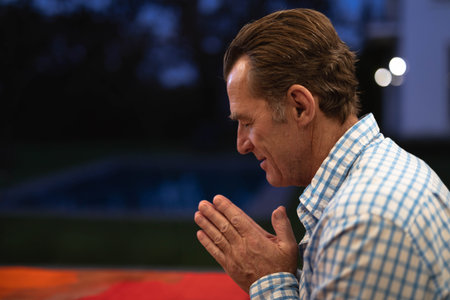 Senior man praying at patio table by red tablecloth and pool under porch lights, copy space. Contemplation, serenity, introspection, tranquil, solitude, reflective, dusk