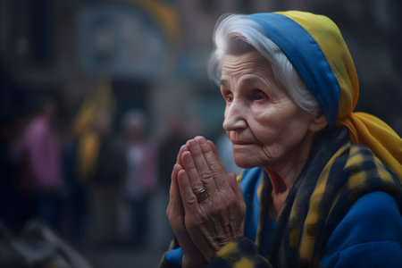 An old grandmother prays for Ukraine, the colors of the Ukrainian flag, Generative AI content