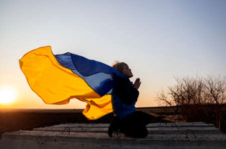 Sad woman with Ukraine flag at background praying. Concept of standing with Ukrainian nation in war with Russia.