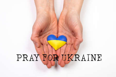 Heart shaped flag of Ukraine in female hands, Pray for Ukraine text. The concept of solidarity with the citizens of Ukraine.