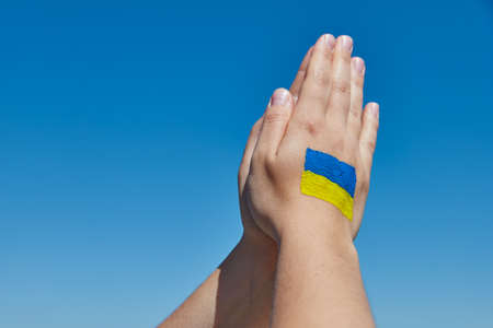 Womans hands with ukrainian flag symbol prays against the blue sky. Stop war