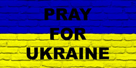 Ukraine. Illustration of the flag of Ukraine with Brick wall texture. Written text, Pray for Ukraine. Horizontal design. Illustration.