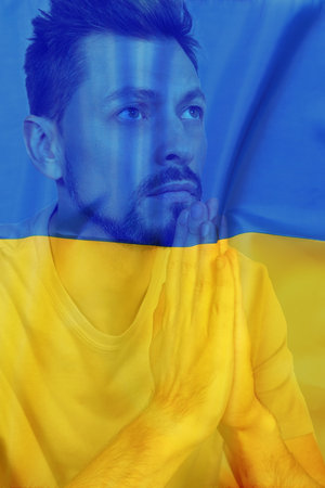 Double exposure of national flag and man praying. Stop war in Ukraine