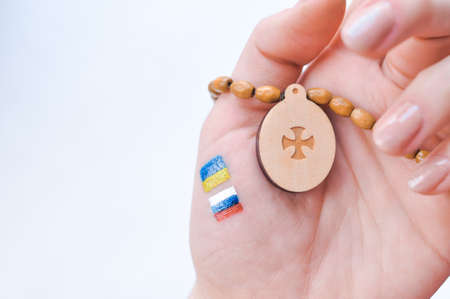 Orthodox Christ and drawned Russian and Ukrainian flags in hand. High quality photo