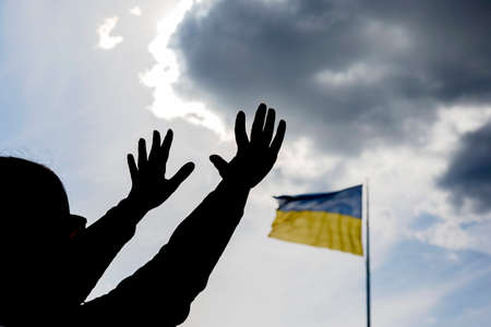 Raised hands to the sky against the background of the flag of Ukraine. Prayer for help and blessings for the country of Ukraine. Protection for the nation.