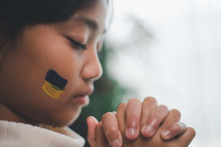 Ukrainian boy closed her eyes and praying to stop the war in Ukraine.