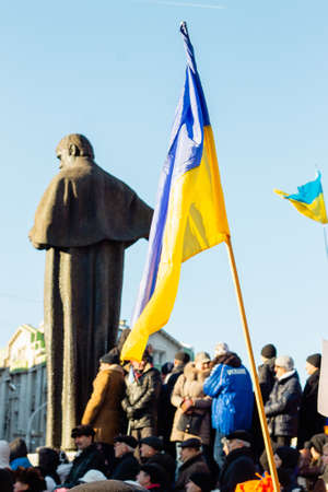 Lviv, Ukraine - December 8, 2013: Protesters with political signs and national ukrainian flags during Revolution of Dignity euromaidan, democracy protests for agreement with EU