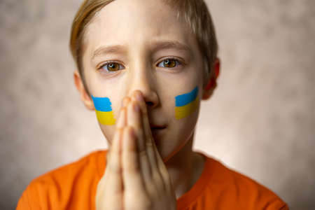 a child against war, a boy with a painted flag of Ukraine on his cheeks folded his hands in a plea for world peace