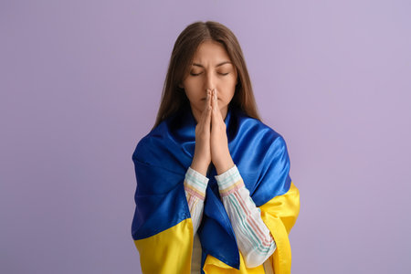 Young woman with Ukrainian flag praying on lilac background